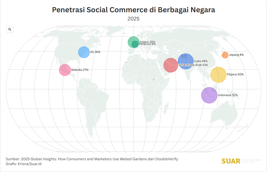 - In a report titled 2025 Global Insights: How Consumers and Marketers Use Walled Gardens by DoubleVerify, which conducted an in-depth survey of 22,000 consumers and 1,970 global marketers, including Indonesia, it was found that 52% of Indonesian consumers predominantly shop through social commerce.