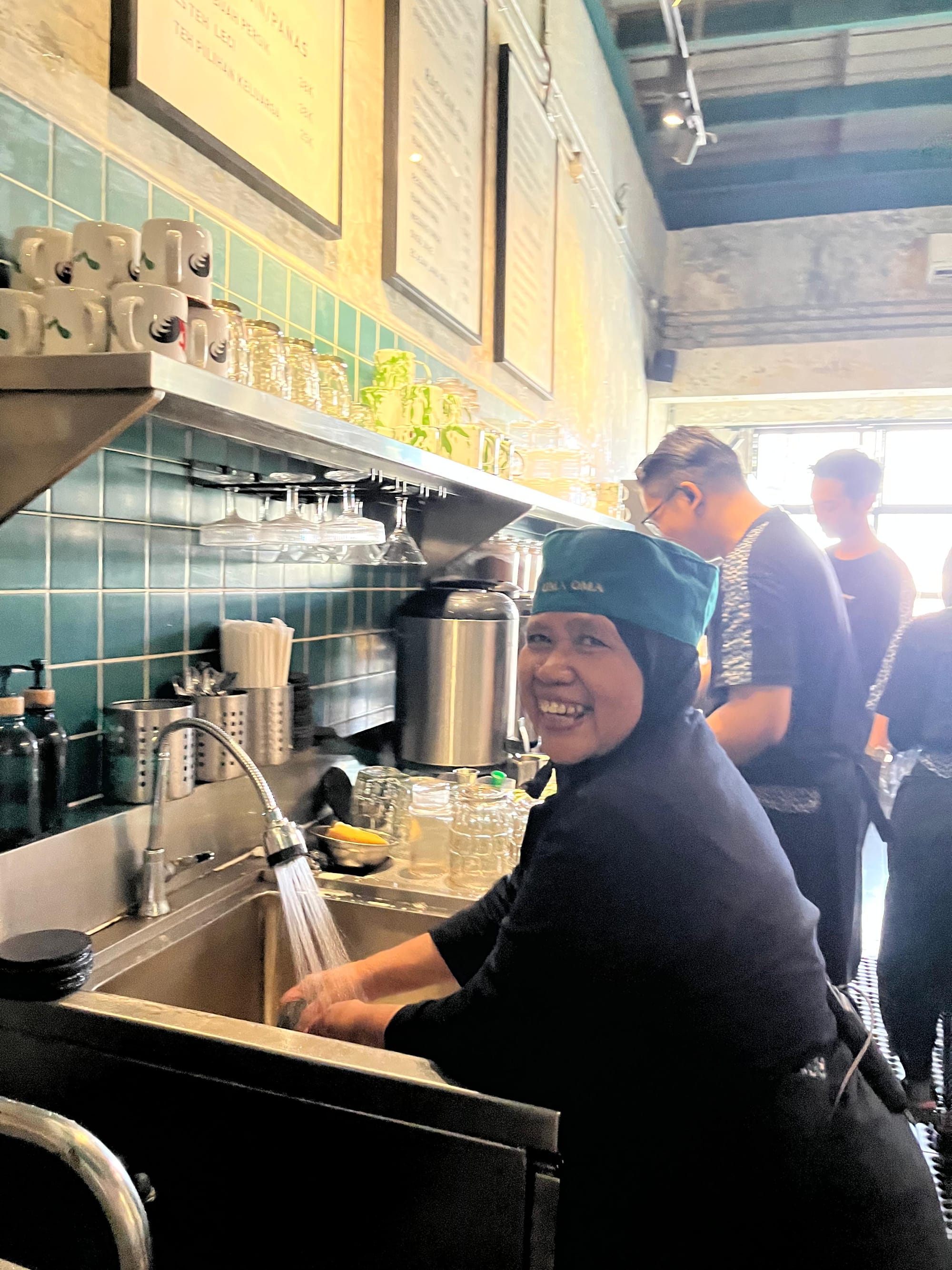 In the kitchen on the second floor, Sustiwati is busy in the corner of the small kitchen, her hands nimbly washing dishes as she talks. She leaves every morning from Ciledug by JakLingko, arriving before eight so she can help set up the cafe.