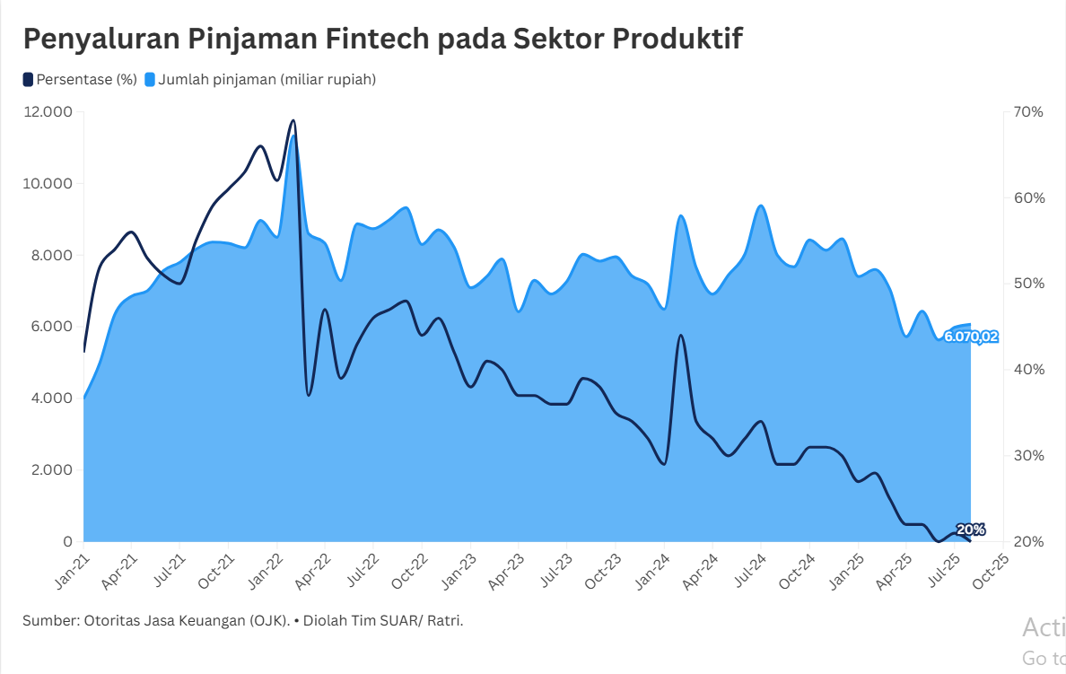 - The percentage of lending to the productive sector peaked in February 2022 at 69% with a loan value of Rp 11,328.84 billion. However, this percentage continued to decline to only 20% in August 2025. This significant decline occurred even though the nominal amount of loans for the productive sector fluctuated relatively between Rp 5 trillion and Rp 9 trillion. This implies that the growth rate of loans for the consumptive sector was much faster than that for the productive sector, resulting in a smaller proportion of productive loans in the total fintech loans.