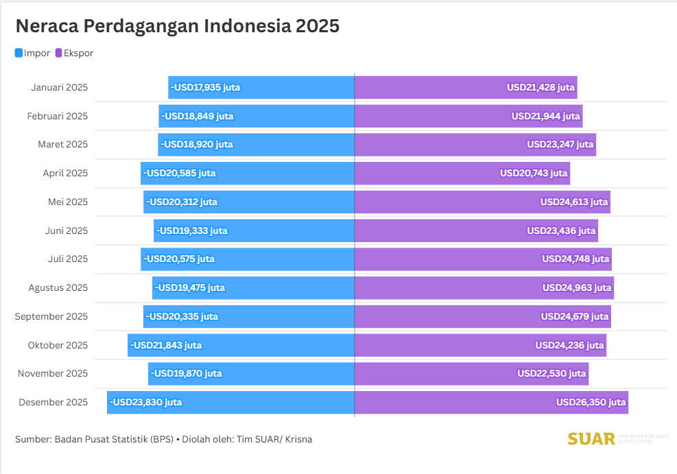 - Di tengah berbagai ketidakpastian global, Indonesia masih melanjutkan surplus neraca perdagangan 68 bulan berturut-turut sejak Mei 2020. Badan Pusat Statistik (BPS) mencatat Januari-Desember 2025 total ekspor Indonesia mencapai USD 282,91 miliar meningkat 6,15% dibandingkan periode yang sama tahun lalu. Sementara itu total impor Januari-Desember 2025 mencapai USD 241,86 miliar. Artinya, selama neraca perdagangan periode Januari-Desember 2025 tercatat surplus sebesar USD 41,05 miliar.