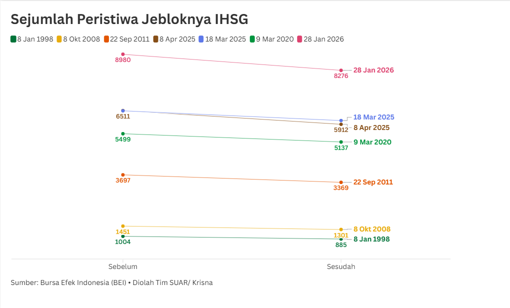 - Belum selesai para investor babak belur dihajar ”longsor” Indeks Harga Saham Gabungan (IHSG) pada perdagangan Rabu (28/1/2026), indeks pasar modal tanah air kembali jeblok pada Kamis (29/1/2026). Hanya dalam 2 hari IHSG terperosok dalam hingga 748 poin.