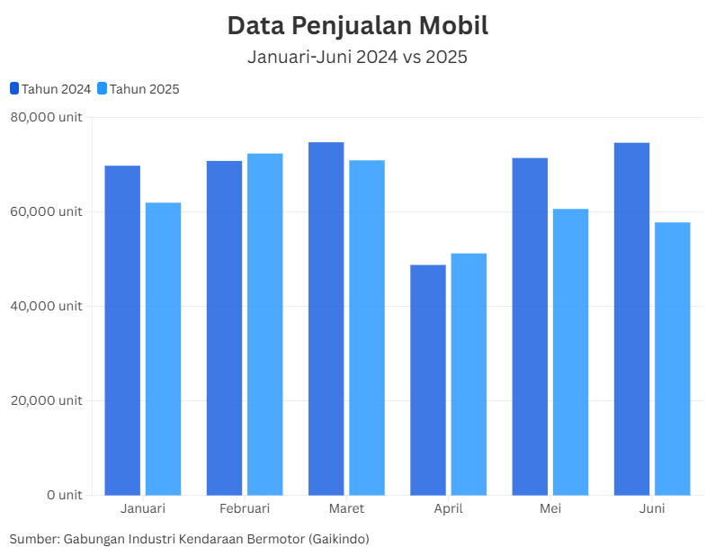 According to the Association of Motor Vehicle Industries (Gaikindo), wholesale car sales in June 2025 amounted to 57,760 units, down 22.6 percent compared to 74,615 units sold in June 2024. Meanwhile, car sales from January to June 2025 reached 374,740 units, down 8.6 percent compared to the same period last year of 410,020 units.