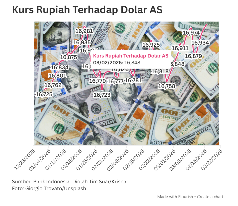 Nilai tukar rupiah terhadap dolar Amerika Serikat (AS) melemah tajam ke posisi Rp16.911, mendekati level Rp17.000 per dolar AS pada hari ini, Rabu (25/3/2025) seiring masih ditutupnya Selat Hormuz.