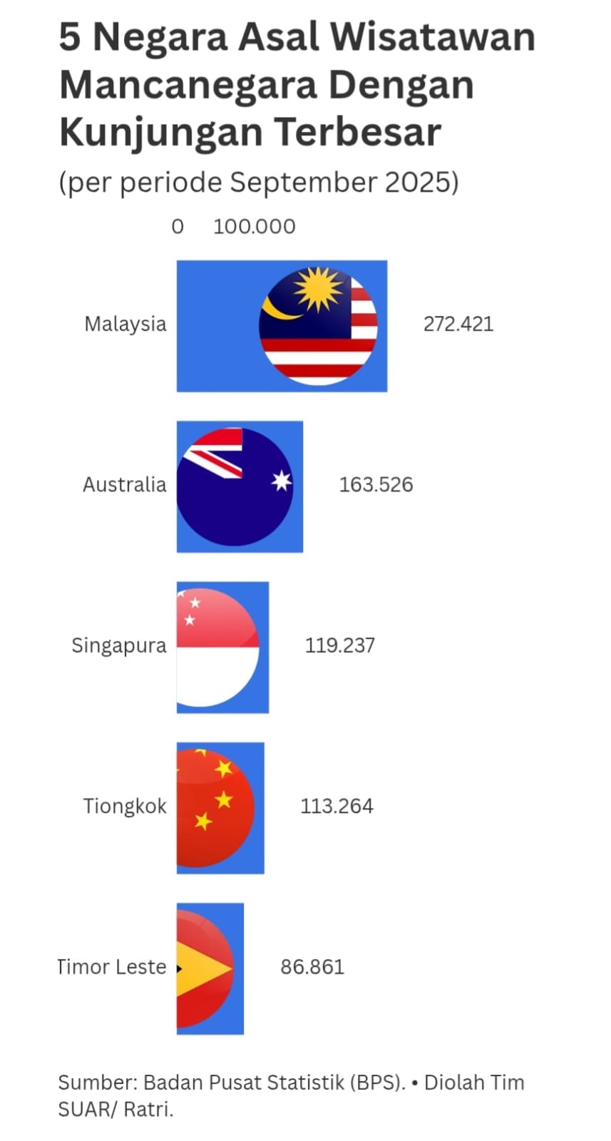 - Dilihat berdasarkan negara asal wisman, jumlah kunjungan terbesar pada September 2025 berasal dari negara-negara tetangga. Wisatawan berkebangsaan Malaysia tercatat 272.421 kunjungan (19,53%), Australia 163.526 kunjungan (11,72%), dan Singapura 119.237 kunjungan (8,55%). Dominasi wisatawan dari Malaysia dan Singapura tak lepas dari faktor kedekatan dengan karakter perjalanan singkat, berulang, atau bisnis.