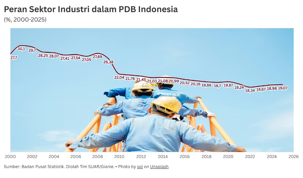 - Ciri negara maju adalah memiliki industri dan ekspor yang kuat. Indonesia memerlukan peta jalan yang tepat dan waktu yang mungkin cukup panjang untuk membangkitkan kembali sektor industri. Selama seperempat abad terakhir, kinerja sektor industri manufaktur Indonesia menurun. Berdasarkan data Badan Pusat Statistik (BPS), kontribusi sektor industri manufaktur terhadap Produk Domestik Bruto (PDB) sejak 2000 hingga 2025 cenderung menurun. Kontribusi tertinggi sektor industri terjadi tahun 2001 dengan persantase di angka 30,1%. Sejak itu peran sektor industri terus menurun hingga di tahun 2025 menjadi 19,07%. Penurunan yang tajam terjadi pada periode 2009-2010, yakni dari 26,38% (2009) menjadi 22,04% (2010). Tahun 2022, peran sektor industri berada di titik terendah, yakni 18,34%.