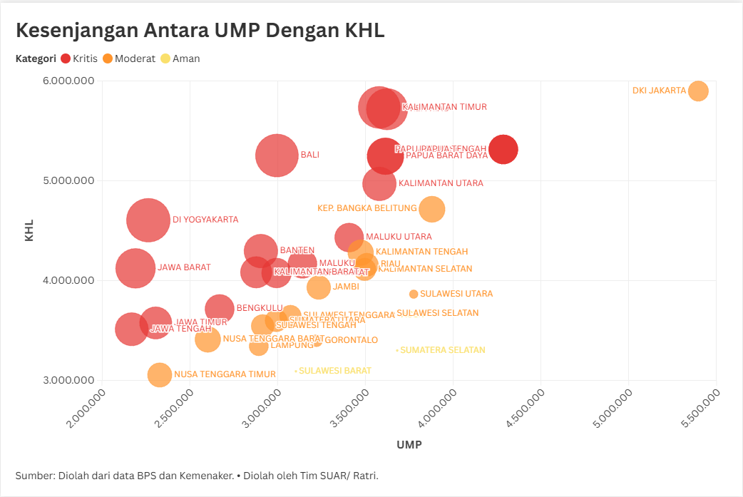 - Berdasarkan tiga kategorisasi yang disusun (Aman-Moderat-Kritis), hanya terdapat tiga provinsi yang masuk dalam kategori Aman dengan gap positif dalam arti UMP lebih tinggi dari KHL. Kategori Moderat atau Menengah adalah gap negatif dengan KHL lebih tinggi antara Rp 1 hingga Rp 1 juta dibandingkan UMP, terjadi di 39,5% atau sekitar 15 provinsi di Indonesia. Adapun pada kategori Kritis, yang dialami lebih dari separuh provinsi di Indonesia (52%) terjadi gap negatif dengan kesenjangan yang lebih tinggi, yaitu KHL lebih tinggi (di atas Rp 1 juta) dibandingkan UMP. Sebanyak 20 provinsi berada dalam lubang defisit yang dalam, dengan D.I. Yogyakarta ( minus Rp 2,34 juta), Bali (minus Rp 2,26 juta), Kalimantan Timur (minus Rp 2,16 juta), dan Kepulauan Riau (minus Rp 2,09 juta) menempati puncak teratas sebagai wilayah dengan gap negatif paling tinggi.