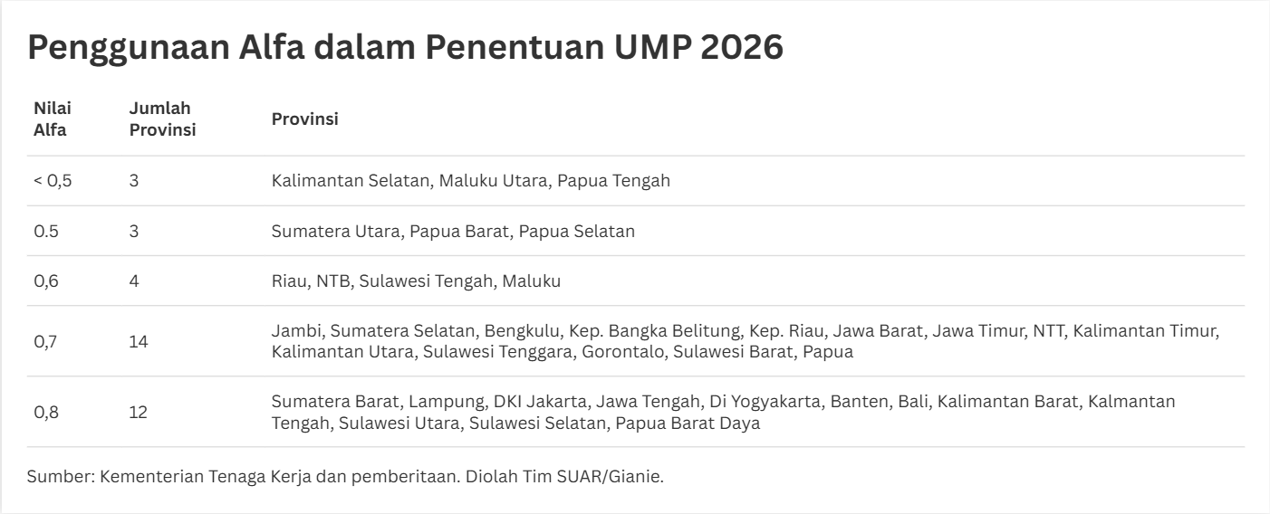 - Dari analisis Tim SUAR dengan melihat persentase kenaikan UMP setiap provinsi, nilai indeks Alfa yang digunakan dominan pada angka 0,7 dan 0,8. Sebanyak 14 provinsi menggunakan indeks Alfa 0,7 dan 12 provinsi menggunakan indeks Alfa 0,8. Selebihnya menggunakan indeks Alfa 0,5 dan 0,6. Bahkan, ada provinsi yang menggunakan Alfa di bawah 0,5. Indeks Alfa merupakan variabel kontribusi tenaga kerja terhadap pertumbuhan ekonomi. Tahun sebelumnya, rentang Alfa yang digunakan adalah 0,1 – 0,3. Berdasarkan PP, perumusan kebijakan pengupahan melibatkan Dewan Pengupahan Daerah, termasuk dalam penentuan nilai Alfa.
