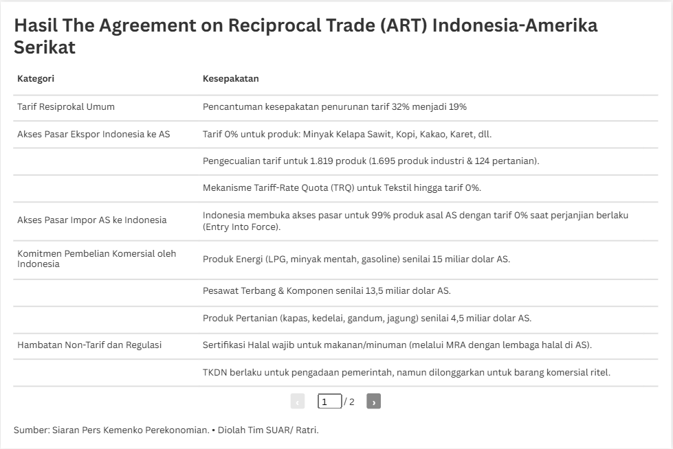 - Kesepakatan perjanjian dagang antara Indonesia dan Amerika Serikat (AS) dinilai memicu relaksasi atau pengenduran aturan besaran tingkat kandungan dalam negeri (TKDN) untuk produk impor dari AS ke Indonesia. Bagaimana duduk persoalannya?