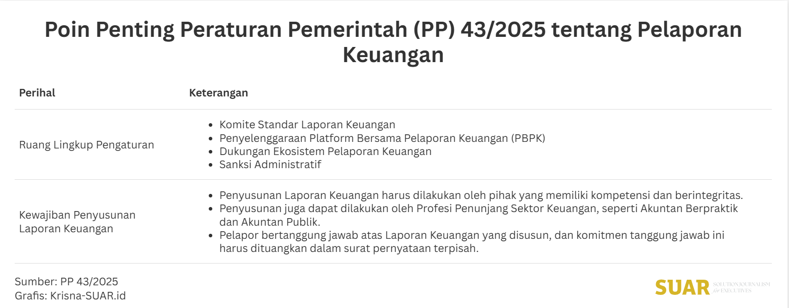 - Peraturan Pemerintah Nomor 43 Tahun 2025 tentang Pelaporan Keuangan mewajibkan setiap perusahaan di Indonesia untuk mengirimkan laporan keuangan ke Kementerian Keuangan (Kemenkeu) mulai tahun 2027. Sejumlah pakar menilai wajib setor laporan keuangan satu pintu akan memperkuat transparansi dan persepsi investor terhadap perusahaan emiten sehingga bisa meningkatkan kualitas data finansial nasional secara menyeluruh.