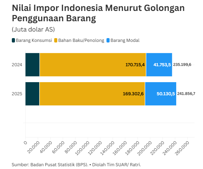 - Ketidakpastian di jalur perdagangan utama dunia secara langsung akan mengerek biaya logistik dan asuransi, yang pada akhirnya membebani harga barang-barang impor. Sebagai negara yang masih bergantung pada arus perdagangan global, Indonesia kini berada di posisi rentan terhadap multiplier effect yang merambah mulai dari sektor energi hingga logistik. Kekhawatiran para pelaku usaha semakin beralasan jika menilik struktur impor Indonesia berdasarkan golongan penggunaan barang. Data tahun 2025 menunjukkan bahwa impor didominasi oleh bahan baku/penolong yang mencapai 169,3 miliar dolar AS, diikuti oleh barang modal senilai 50,1 miliar dolar AS. Ketergantungan yang tinggi pada bahan baku/penolong ini menciptakan efek domino bagi inflasi di tingkat konsumen. Jika biaya perolehan bahan baku meningkat akibat konflik global, pengusaha dihadapkan pada dua pilihan sulit.