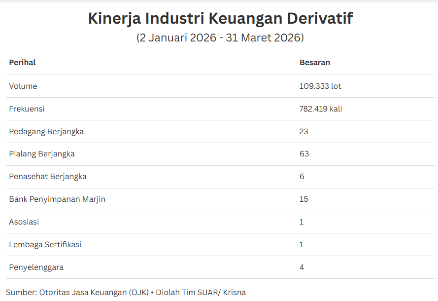 - Otoritas Jasa Keuangan (OJK) merancang roadmap pengembangan pasar derivatif 2026–2030 untuk memperdalam struktur pasar keuangan nasional dengan mendorong inovasi produk sekaligus memperketat mitigasi risiko. Ini untuk mendorong pasar derivatif berkembang lebih pesat setelah selama ini pertumbuhannya relatif stagnan. Dalam peta jalan tersebut, OJK menempatkan perlindungan investor sebagai titik awal pengembangan. Kebijakan ini diterjemahkan melalui sejumlah instrumen pengendalian risiko, seperti segmentasi investor antara ritel dan profesional, pembatasan penggunaan leverage, serta penerapan negative balance protection untuk memastikan kerugian tidak melebihi dana yang dimiliki investor.