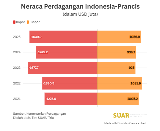 - Presiden Indonesia Prabowo Subianto dan Presiden Prancis Emmanuel Macron menyepakati kerjasama di beberapa bidang, mulai dari pengadaan alat utama sistem persenjataan hingga ekonomi. Pertemuan ini menjadi bagian dari rangkaian diplomasi Eropa Indonesia setelah kunjungan sebelumnya ke Rusia, sekaligus menandai upaya pemerintah memperdalam kemitraan strategis dengan negara utama di kawasan tersebut. Dalam pertemuan tersebut, kedua kepala negara membahas sejumlah bidang prioritas yang dinilai memiliki dampak langsung terhadap penguatan hubungan ekonomi dan strategis kedua negara. Fokus kerjasama mencakup pengadaan alat utama sistem persenjataan (alutsista), penguatan industri pertahanan, transisi energi, pengembangan energi baru terbarukan, infrastruktur, transportasi, pendidikan, hingga ekonomi kreatif.
