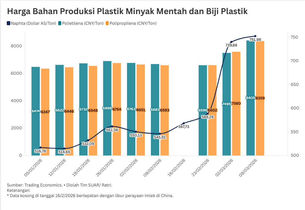 - Selama periode Januari hingga Maret 2026, harga nafta melonjak drastis dari kisaran USD 516,76 per ton pada awal Januari menjadi USD 751,98 per ton pada 9 Maret 2026, atau meningkat sekitar 45%. Lonjakan beban di sektor hulu ini secara linier menyeret harga biji plastik di tingkat regional. Kini, polietilena (PE) dan polipropilena (PP) kini menembus angka CNY 8.300 per ton, naik signifikan dibandingkan rata-rata awal tahun yang masih di level CNY 6.300-CNY 6.400 per ton.