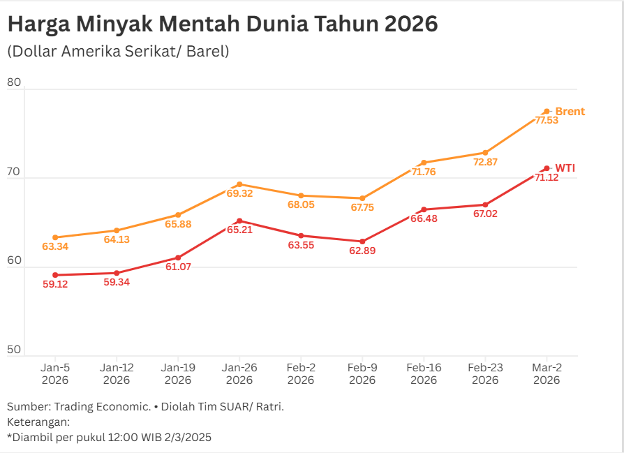 - Konflik AS dengan Iran yang memanas dikhawatirkan mengganggu stabilitas pasokan di Selat Hormuz, jalur nadi utama bagi distribusi minyak mentah dunia. Sebab, sekitar 20% distribusi minyak dunia melalui kawasan ini. Konflik ini tidak hanya menciptakan ketidakpastian politik, tetapi juga langsung memberikan tekanan pada pasar komoditas energi. Memasuki tahun 2026, tren harga minyak mentah menunjukkan volatilitas yang tinggi. Berdasarkan data terbaru per 2 Maret 2026, pasar mengalami lonjakan yang signifikan di mana harga Brent telah menyentuh angka 77 dollar AS/barel, meningkat sekitar 22,40% dibandingkan posisi awal tahun. Jika menilik perjalanan harga sepanjang 2026, lonjakan di awal Maret ini merupakan puncak dari rentetan fluktuasi mingguan. Pada Januari, harga sempat berada di level yang relatif rendah, yakni di kisaran 59 dollar AS/barel untuk WTI, karena pasar masih optimistis terhadap ekspansi produksi dari Guyana dan Brasil.