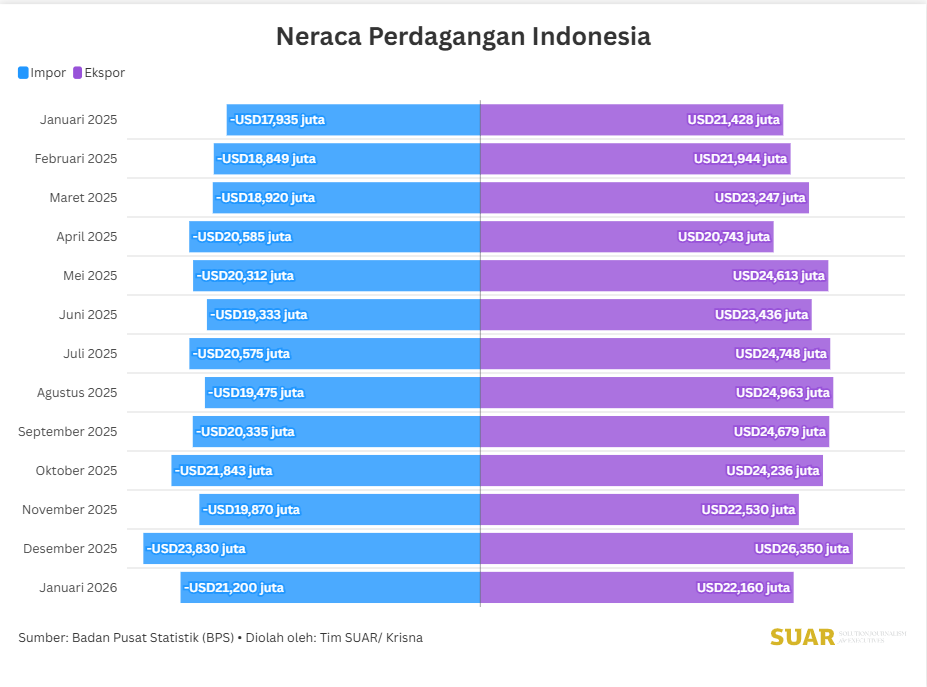 - Indonesia mempertahankan surplus neraca perdagangan selama 69 bulan berturut-turut sejak Mei 2020, ini tecermin dari kinerja neraca perdagangan Januari 2026 yang surplus USD0,95miliar. Kendati masih surplus, namun besaran surplus mengecil bila dibandingkan Desember 2025 yang sebesar USD2,51 miliar.