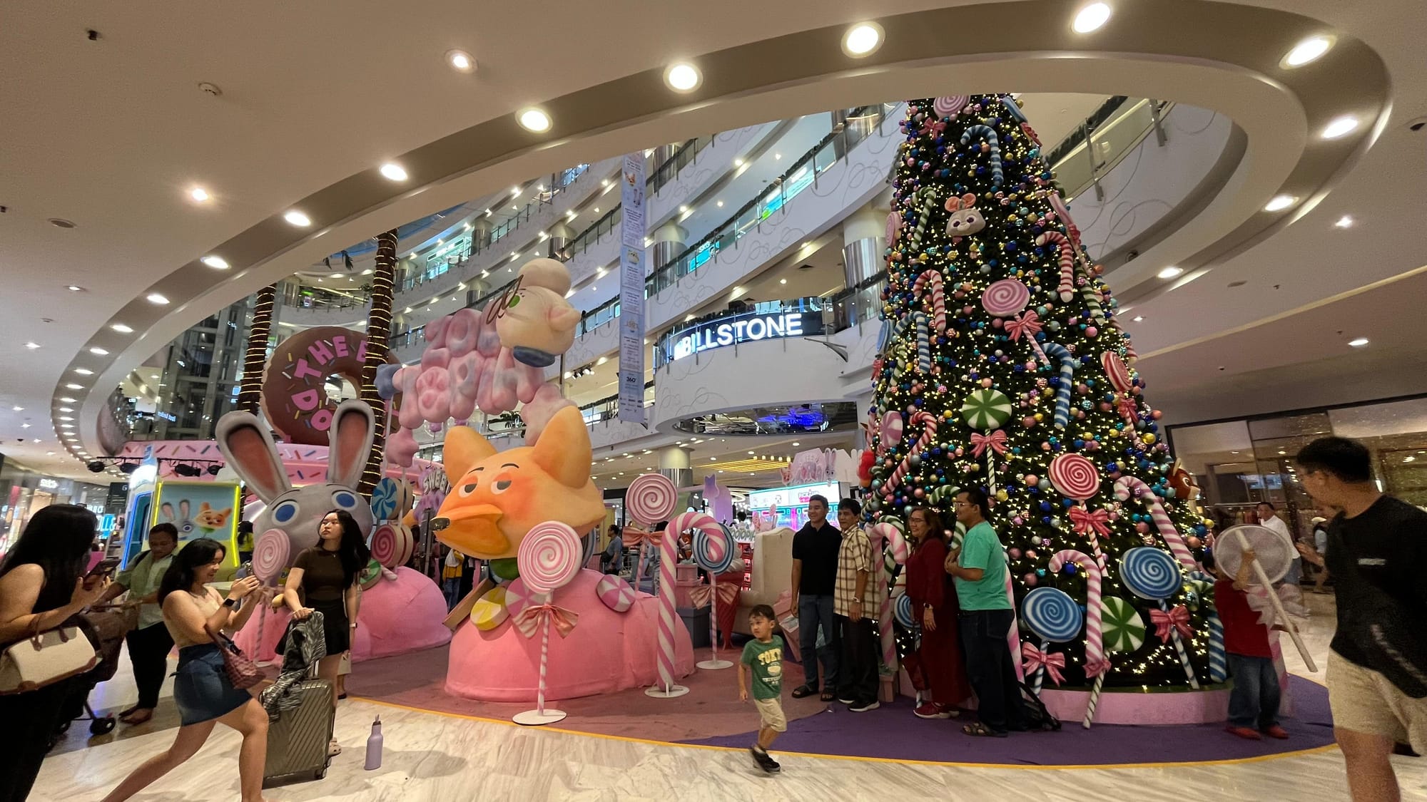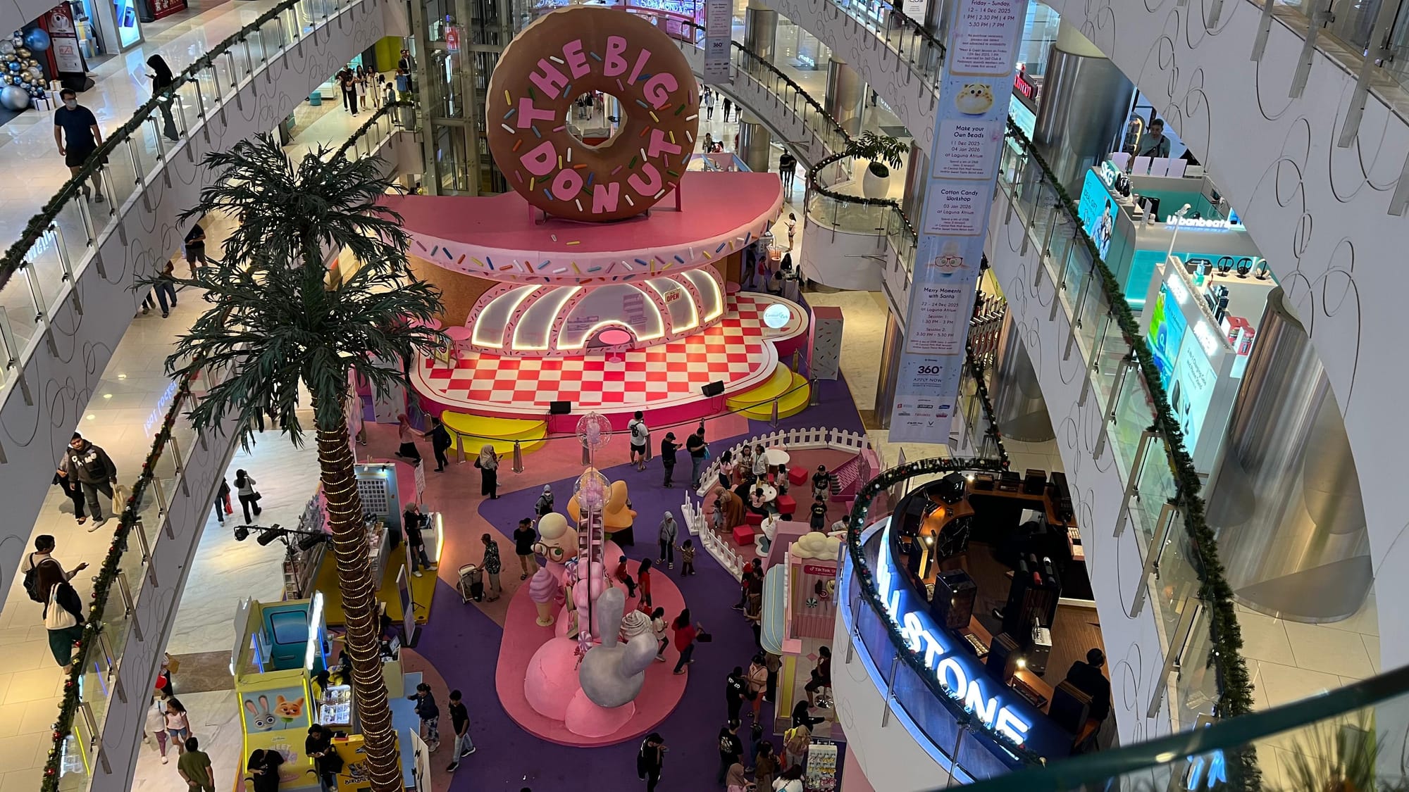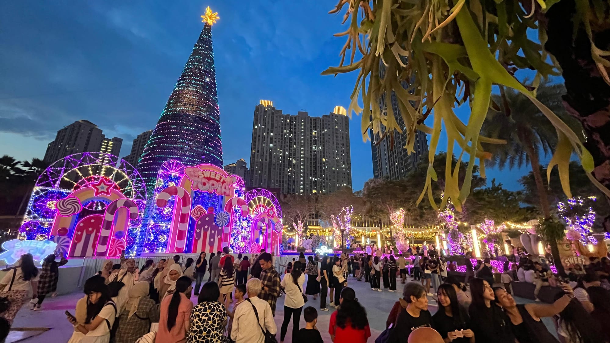 Pohon Natal raksasa berwarna pastel, instalasi panggung berlatar permen dan es krim, hingga arena bermain anak membalut suasana hangat dan ceria. Tetap terasa khas natal, namun dengan wajah yang lebih manis dan ramah keluarga.