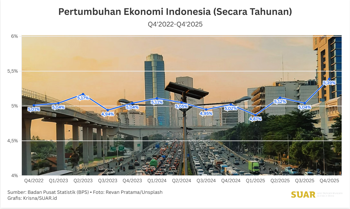 - Badan Pusat Statistik (BPS) mengumumkan pertumbuhan ekonomi Indonesia sepanjang 2025 mencapai 5,11%. Pencapaian ini lebih tinggi daripada pertumbuhan ekonomi pada 2024 sebesar 5,03%. Pada 2025 besaran Produk Domestik Bruto (PDB) Atas Dasar Harga Berlaku dan Harga Konstan 2010 sebesar Rp 13.580,5 triliun, meningkat dibandingkan 2024 yang sebesar Rp 12.920,3 triliun. Adapun pertumbuhan ekonomi pada triwulan keempat 2025 mencapai 5,39% secara tahunan.