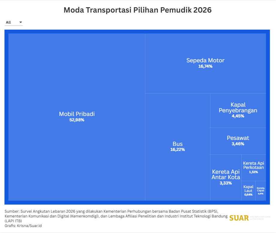 - Berdasarkan Survei Angkutan Lebaran 2026 yang dilakukan Kementerian Perhubungan bersama Badan Pusat Statistik (BPS), Kementerian Komunikasi dan Digital (Kemenkomdigi), dan Lembaga Afiliasi Penelitian dan Industri Institut Teknologi Bandung (LAPI ITB), menyebutkan beragam jenis moda transportasi pilihan pemudik. Secara komposisi, mayoritas perjalanan masih didominasi kendaraan pribadi sebesar 69,72% atau sekitar 100,32 juta orang. Rinciannya, mobil pribadi mencapai 52,98% dan sepeda motor 16,74%. Sementara penggunaan transportasi umum relatif lebih rendah, dengan bus sebesar 16,22% (23,34 juta), kapal penyeberangan 4,45% (6,40 juta), pesawat 3,46% (5,98 juta), kereta api antarkota 3,33% (4,79 juta), KA perkotaan 1,51% (2,17 juta), kapal laut 0,64% (926,12 ribu), dan kereta cepat 0,47% (682,90 ribu). Adapun secara keseluruhan diperkirakan sebanyak 143,9 juta orang melakukan perjalanan selama periode mudik.