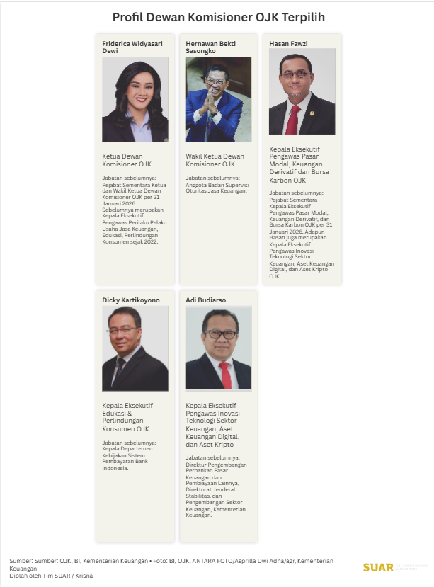 - Ketua Mahkamah Agung resmi melantik jajaran Dewan Komisioner Otoritas Jasa Keuangan (OJK) periode 2026-2031, dengan Friderica Widyasari Dewi sebagai Ketua, guna memperkuat stabilitas dan pengawasan terintegrasi di sektor jasa keuangan. Selain itu turut dilantik Hernawan Bekti Sasongko sebagai Wakil Ketua. Selain itu, Hasan Fawzi dilantik sebagai Kepala Eksekutif Pengawas Pasar Modal, Keuangan Derivatif, dan Bursa Karbon, Adi Budiarso sebagai Kepala Eksekutif Pengawas Inovasi Teknologi Sektor Keuangan, Aset Keuangan Digital, dan Aset Kripto, serta Dicky Kartikoyono sebagai Kepala Eksekutif Pengawas Perilaku Pelaku Usaha Jasa Keuangan, Edukasi, dan Pelindungan Konsumen.