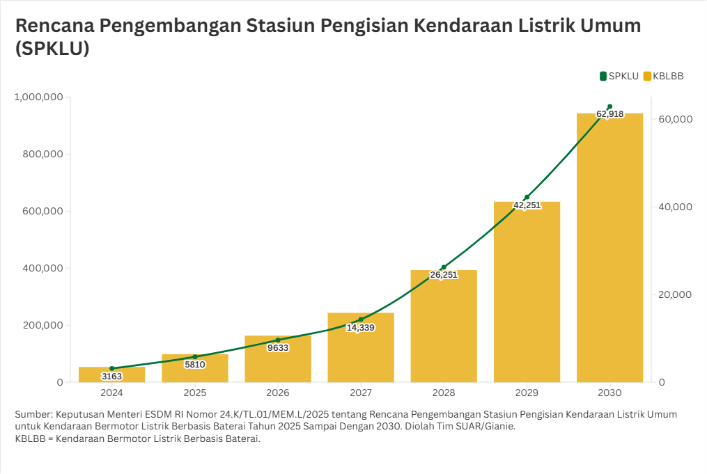 - Untuk mendorong perluasan penggunaan kendaraan listrik di tanah air, penyediaan infrastruktur berupa stasiun pengisian daya digenjot pemerintah. Hingga tahun 2030, pemerintah merencanakan penambahan stasiun pengisian kendaraan listrik umum (SPKLU) hingga 62.918 stasiun di lokasi-lokasi strategis. Dalam mengembangkan ekosisten kendaraan listrik (electric vehicle/EV), pemerintah berkomitmen menyediakan infrastruktur pendukung utama, yakni stasiun pengisian kendaraan listrik umum (SPKLU). Hal itu tak lain agar para pengguna kendaraan listrik merasa nyaman berkendara tanpa resah kehabisan daya di tengah perjalanan.