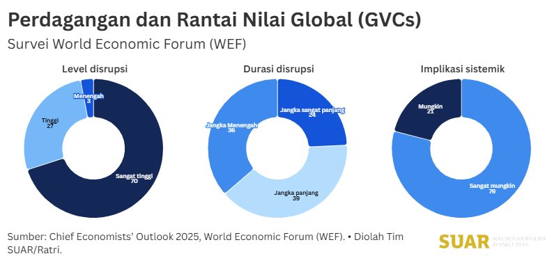 - Survei World Economic Forum (WEF) Chief Economists' Outlook September 2025 – yang menyoroti berbagai permasalahan ekonomi global hingga regional – juga mengungkap bahwa pilar-pilar ekonomi global yang menjadi perhatian para ekonom dunia kini berpusat pada kerentanan perdagangan. Dalam penilaian pilar perdagangan dan rantai nilai global atau global value chains (GVCs), 70% responden yang merupakan ekonom ini menilai level disrupsi sangat tinggi. Bahkan, sebanyak 79% ekonom tersebut menilai hal tersebut sangat berdampak secara sistemik.
