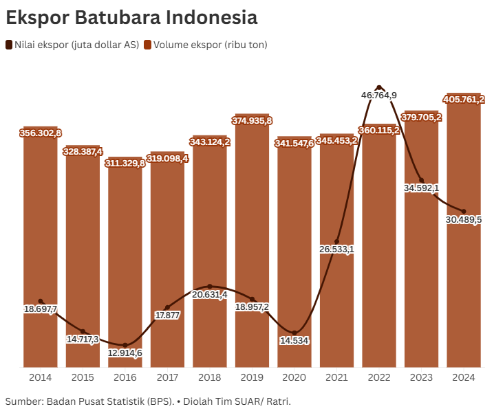 - Pemberlakuan bea keluar menjadi tantangan bagi pertambangan batubara yang selama ini menjadi tulang punggung ekspor dan berkontribusi besar terhadap produk domestik bruto (PDB). Sektor mineral dan batubara (minerba) menunjukkan kontribusi yang signifikan terhadap PDB. Di tahun 2022 kontribusinya sebesar 9,2%. Namun, perannya menurun menjadi sekitar 6,8% pada 2025, dengan nilai kontribusi sebesar Rp 1.805,8 triliun (2022) menjadi Rp 1.613,1 triliun (2025). Penurunan persentase ini agaknya terjadi dipengaruhi oleh harga komoditas atau peningkatan di sektor lain. Di tahun 2025 (hingga triwulan III), nilai kontribusi sektor ini naik 7,5% dibandingkan tahun sebelumnya.