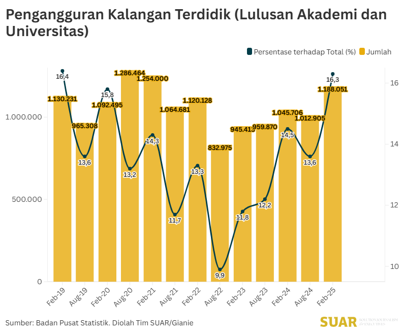 - Program magang bergaji ini merupakan upaya terobosan pemerintah untuk menekan angka pengangguran di kalangan terdidik. Data Badan Pusat Statistik (BPS) menunjukkan, meski angka pengangguran per Februari 2025 menurun jadi 7,28 juta orang (4,76%), angka pengangguran pada kalangan terdidik justru meningkat 17,3% dibandingkan dengan kondisi Agustus 2024.
