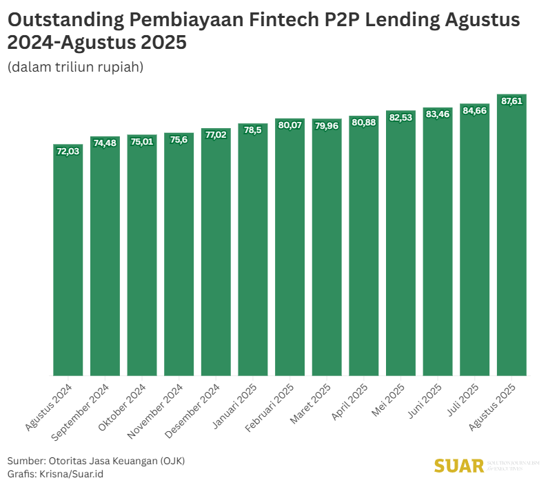 - Otoritas Jasa Keuangan (OJK) mencatat nilai outstanding pembiayaan peer to peer (P2P) lending atau pinjaman utang online (pinjol) masyarakat mencapai Rp 87,61 triliun per Agustus 2025 – meningkat 21,62% dibandingkan periode yang sama tahun lalu sebesar Rp 72,03 triliun. Indikator kredit macet industri yang tercermin di tingkat wanprestasi (TWP) 90 hari industri ini juga masih rendah. Pada Agustus 2025, TWP 90 dalam posisi 2,62%.