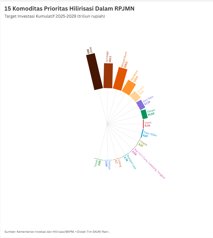 - Pemerintah Indonesia telah menetapkan 15 komoditas prioritas hilirisasi dalam Rencana Pembangunan Jangka Menengah Nasional (RPJMN) 2025-2029 dengan target investasi kumulatif yang sangat besar. Dalam Rapat Komisi XII DPR RI dengan Menteri Investasi dan Hilirisasi/Kepala BKPM, target investasi 15 komoditas utama hilirisasi antara lain sektor mineral dan energi, seperti nikel (Rp 365,0 triliun), tembaga (Rp 252,1 triliun), minyak bumi (Rp 226,1 triliun), gas bumi (Rp 132,8 triliun), serta bauksit (Rp 70,8 triliun). Selain itu, komoditas dari sektor perikanan, pertanian, dan industri lainnya seperti besi baja (Rp 57,19 triliun), garam (Rp 51,63 triliun), sawit (Rp 9,36 triliun), pasir silika (Rp 8,67 triliun), tilapia (Rp 3,12 triliun), ikan TCT (Rp 3,08 triliun), rumput laut (Rp 2,79 triliun), udang (Rp 2,7 triliun), kelapa (Rp 2,69 triliun), dan timah (Rp 2,65 triliun) turut menjadi pilar utama dalam memperkuat struktur ekonomi nasional melalui pengolahan sumber daya alam di dalam negeri.