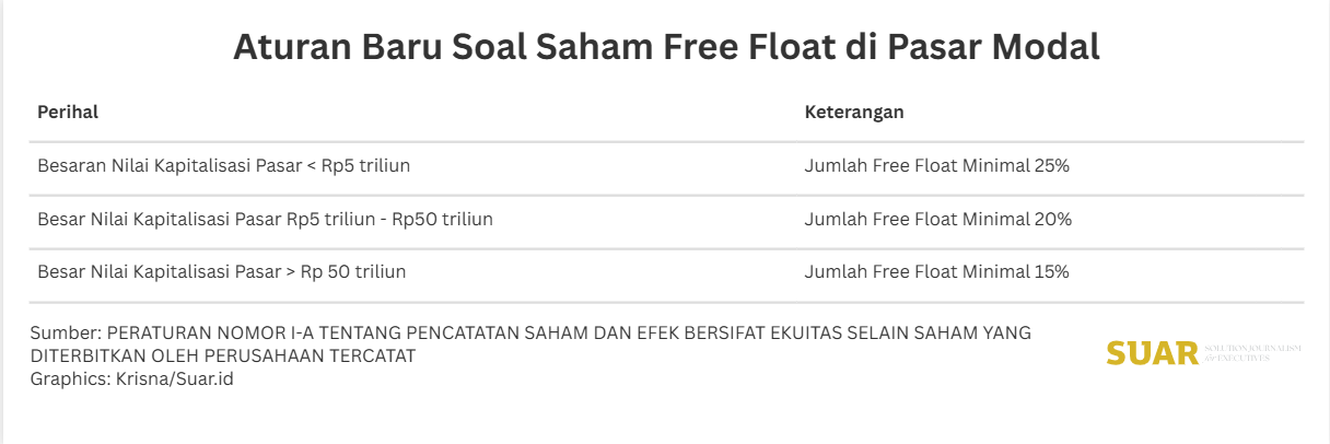 - Aturan baru ini juga mengatur besaran minimum free float disesuaikan dengan nilai kapitalisasi saham. Bagi calon perusahaan tercatat dengan kapitalisasi pasar sebelum tanggal pencatatan kurang dari Rp 5 triliun, maka free float yang ditetapkan paling sedikit 25% dari jumlah saham yang akan dicatatkan di bursa. Kemudian, paling sedikit 20% dari jumlah saham yang akan dicatatkan di bursa, bagi calon perusahaan tercatat yang memiliki nilai kapitalisasi saham sebelum tanggal pencatatan Rp 5 triliun hingga Rp 50 triliun. Bagi calon perusahaan tercatat yang memiliki nilai kapitalisasi saham sebelum tanggal pencatatan lebih dari Rp 50 triliun, free float ditetapkan minimum 15 % dari jumlah saham yang akan dicatatkan di bursa. Jumlah saham free float setelah penawaran umum, atau bagi perusahaan publik dalam periode 5 (lima) hari bursa sebelum permohonan pencatatan, paling sedikit 300.000.000 (tiga ratus juta) saham.