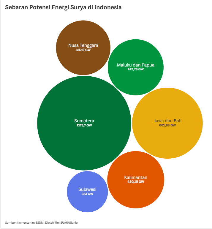 - Indonesia memiliki potensi energi baru terbarukan (EBT) yang besar dan beragam untuk mendukung ketahanan energi nasional dan mencapai target bauran energi terbarukan. Dari beberapa jenis energi, potensi energi surya adalah yang terbesar yang dimiliki. Data Kementerian Energi dan Sumber Daya Mineral (ESDM) menyebutkan Indonesia memiliki potensi energi baru dan terbarukan (EBT) dari berbagai jenis sebesar 3.687 gigawatt (GW). Dari jumlah tersebut, potensi terbesar berasal dari energi surya, yaitu sebanyak 3.294 GW atau 89,3% dari total potensi energi yang ada. Setelah potensi energi surya, berikutnya ada pula energi angin dan energi air dengan potensi masing-masing 155 GW dan 95 GW.