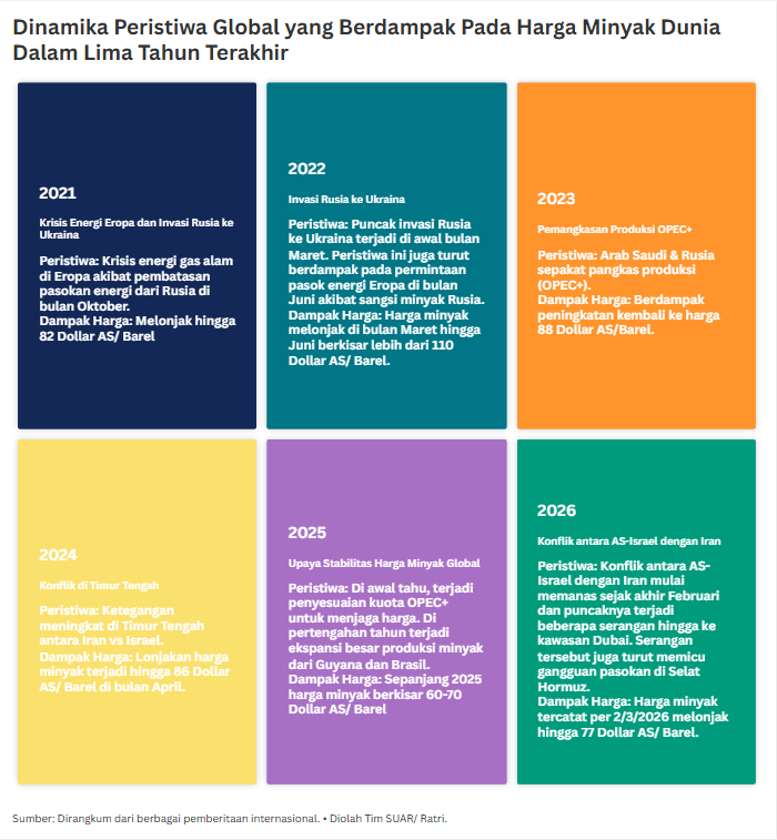 - Harga rata-rata minyak mentah Indonesia atau Indonesian Crude Price (ICP) pada Maret 2026 ditetapkan sebesar USD102,26 per barel di tengah meningkatnya ketegangan geopolitik global. Angka tersebut naik hampir dua kali lipat dibandingkan bulan sebelumnya di level USD68,79 per barel. Untuk menjaga kepastian pasokan energi, Indonesia disarankan melanjutkan strategi diversifikasi impor energi. Kenaikan harga ICP sejalan dengan tren harga minyak mentah utama dunia yang juga mengalami peningkatan tajam.
