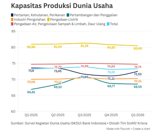 - Survei Kegiatan Dunia Usaha (SKDU) yang dirilis Bank Indonesia (BI) pada Jumat (17/4/2026) menunjukkan, kapasitas produksi yang terpakai pada triwulan I-2026 tercatat sebesar 73,33% meningkat tipis dibandingkan triwulan IV-2025 yang sebesar 73,15%. Kenaikan kapasitas produksi ditopang oleh lapangan usaha pertanian; kehutanan dan Perikanan; serta lapangan usaha Industri Pengolahan. Namun, dunia usaha perlu mewaspadai tekanan kenaikan berbagai biaya produksi di triwulan II-2026 dampak konflik berkepanjangan gejolak di Timur Tengah.