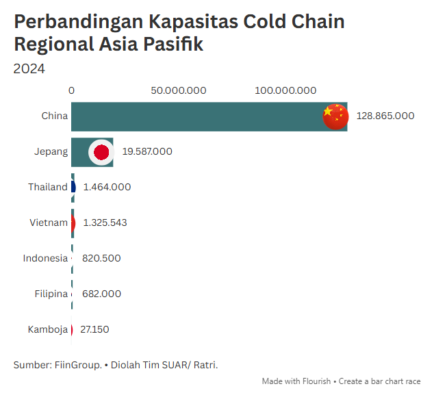 - Keberadaan infrastruktur rantai dingin (cold chain) menjadi tulang punggung yang menentukan daya saing produk Indonesia di kancah global. Berdasarkan data Instalasi Cold Storage Nasional 2024, dominasi kapasitas saat ini masih terpusat pada sektor logistik sejuk sewaan (rental cold logistics) yang mencapai lebih dari 1 juta posisi palet. Namun, jika menelisik lebih dalam pada sektor-sektor produksi spesifik, angka instalasi masih tergolong sangat minim, seperti pada sektor produk susu (dairy food) dan hortikultura yang menunjukkan keterbatasan fasilitas pendingin di titik hulu produksi.