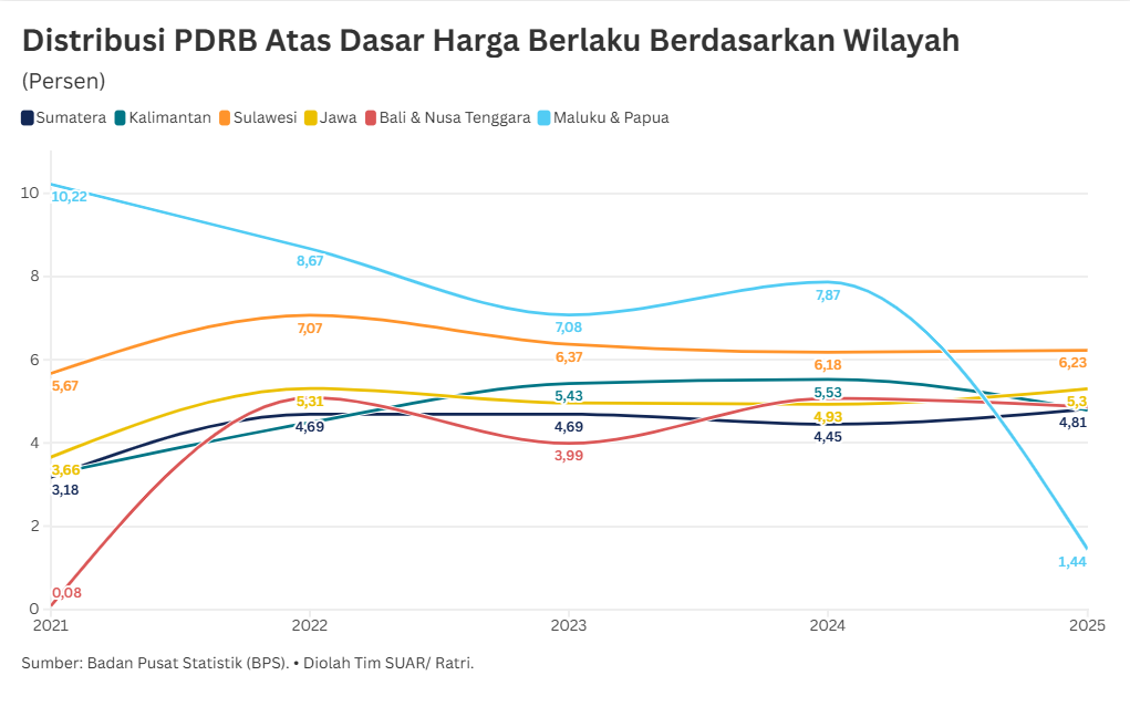 - Potret ekonomi Indonesia tahun 2025 masih menunjukkan dominasi kuat Pulau Jawa dalam perekonomian nasional. Namun, mulai muncul titik-titik pertumbuhan baru di wilayah timur. Berdasarkan data Badan Pusat Statistik (BPS), Pulau Jawa tetap menjadi tulang punggung utama perekonomian nasional dengan distribusi Produk Domestik Regional Bruto (PDRB) mencapai 56,93% dan laju pertumbuhan yang solid di angka 5,3%. Meskipun Jawa mendominasi secara volume, Pulau Sulawesi mencuri perhatian sebagai wilayah dengan laju pertumbuhan ekonomi tertinggi nasional, yakni mencapai 6,23%. Pertumbuhan impresif ini didorong secara signifikan oleh Provinsi Sulawesi Selatan dan Sulawesi Tengah.