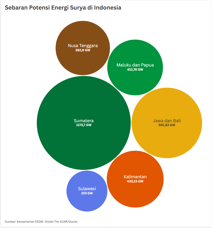 - Pemerintah Indonesia terus mempercepat transisi energi dengan fokus utama pengembangan Pembangkit Listrik Tenaga Surya (PLTS). Indonesia punya potensi besar mengingat letak geografis Indonesia di garis khatulistiwa dengan paparan sinar matahari yang melimpah sepanjang tahun. Langkah ini juga sejalan dengan komitmen Indonesia dalam mencapai target net zero emission pada 2060 atau lebih cepat. Dorongan pengembangan PLTS semakin kuat seiring dengan arahan Presiden Prabowo Subianto yang menargetkan pembangunan kapasitas PLTS hingga 100 gigawatt (GW) pada 2029. Target ambisius ini mencerminkan keseriusan pemerintah untuk menjadikan energi surya sebagai tulang punggung bauran energi nasional di masa depan. Selain itu, pengembangan PLTS diharapkan dapat meningkatkan ketahanan energi sekaligus mengurangi impor bahan bakar energi.