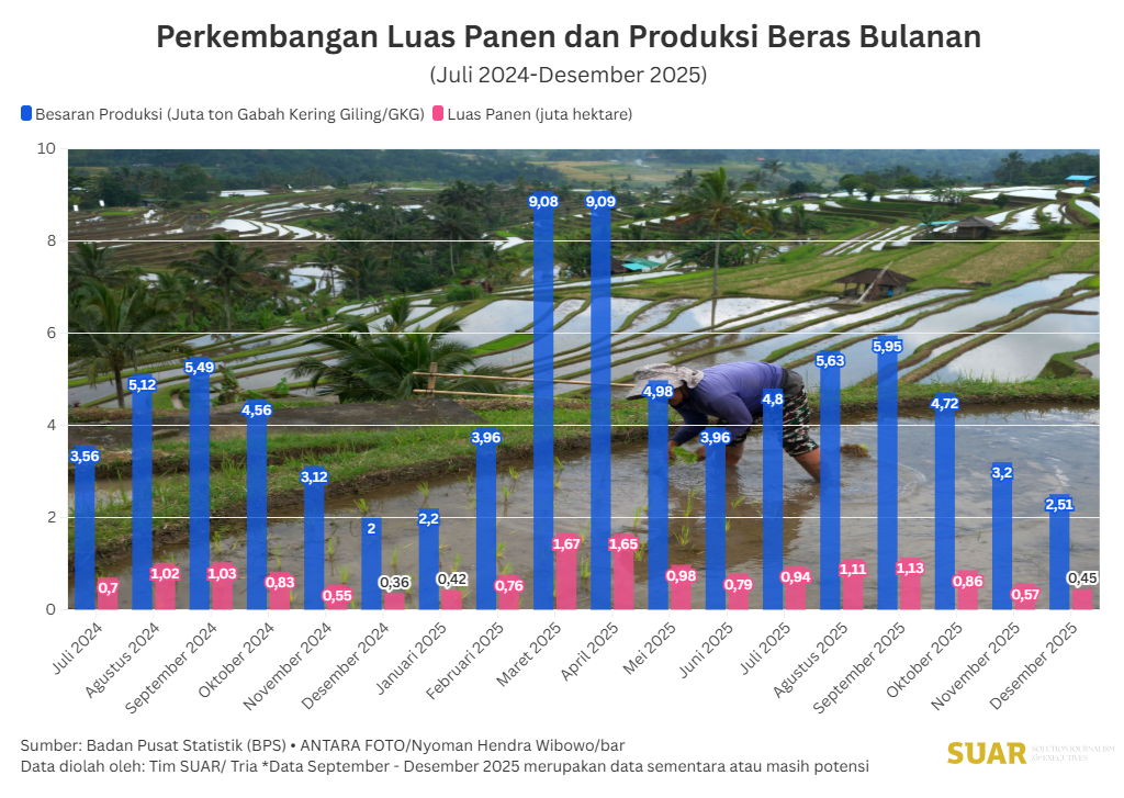- Presiden Prabowo Subianto mengumumkan pada Rabu (7/1/2025), Indonesia berhasil mencapai swasembada pangan pada akhir 2025, atau tiga tahun lebih cepat dari target sebelumnya 2029. Sepanjang 2025, produksi beras Indonesia mencapai 34,71 juta ton dan tertinggi sepanjang sejarah. Panen dilakukan menggunakan teknologi combine harvester yang memungkinkan proses panen dilakukan lebih cepat, menekan kehilangan hasil, serta mengurangi ketergantungan pada tenaga kerja manual. Selain itu, teknologi yang telah disebarluaskan dan diadopsi oleh petani juga terlihat dari varietas unggul padi Inpari 32. Benih padi yang dikembangkan Kementerian Pertanian ini memiliki potensi hasil 8,42 ton per hektare, sebuah teknologi pengungkit produksi padi nasional. Presiden Prabowo mendorong agar ke depan varietas unggul padi terus dikembangkan untuk menghasilkan produktivitas hingga 15 ton per hektare.