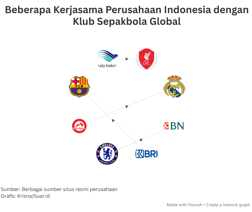 - Perusahaan Indonesia rupanya kerapkali menjadi sponsor klub sepakbola dunia. Yang teranyar ada kerjasama BRI dengan FC Barcelona. Sebelumnya ada Garuda Indonesia dengan Liverpool, Dua Kelinci dengan Real Madrid, dan masih banyak lainnya. Apa yang mereka cari? Bagaimana perhitungan bisnisnya?