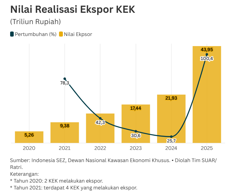 - Menariknya, meskipun realisasi investasi tahun 2025 mengalami sedikit penurunan dibandingkan tahun 2024, ekspor dari kawasan khusus ini justru meningkat. Berdasarkan data realisasi ekspor, nilai ekspor KEK pada tahun 2025 melonjak hingga mencapai Rp 43,95 triliun atau naik dua kali lipat dibandingkan 2024.