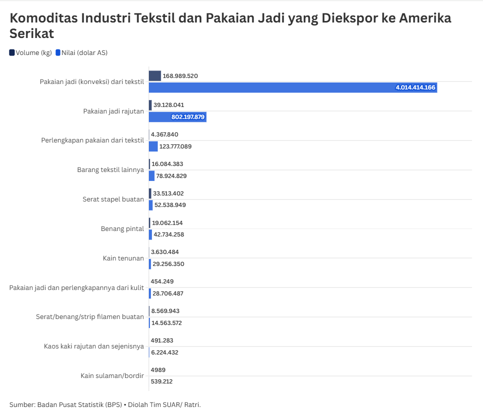 Tren ekspor Indonesia ke Amerika Serikat menunjukkan dominasi yang timpang antara sektor industri pakaian jadi (hilir) dibandingkan dengan industri tekstil (hulu/antara). Data BPS mencatat bahwa produk Pakaian jadi (konveksi) dari tekstil menjadi tulang punggung utama dengan volume mencapai 168,9 juta kg dan nilai yang sangat fantastis, yakni 4,01 miliar dolar AS.