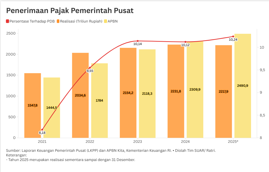 - Penerimaan pajak tahun 2025 yang tidak sesuai target menyebabkan nilai defisit membengkak jadi Rp 695,1 triliun. Posisi fiskal Indonesia kini mendekati ambang batas aman konstitusional sebesar 3%, yakni di angka 2,92%. Terkait hal ini, Dana Moneter Internasional (IMF) mengusulkan agar Indonesia menaikkan pajak penghasilan sebagai solusi menekan defisit tetap di bawah ambang 3%. IMF menilai bahwa penguatan basis pajak penghasilan dapat menjadi instrumen efektif untuk meningkatkan rasio pajak terhadap PDB yang saat ini masih berfluktuasi di kisaran 8% hingga 10%.