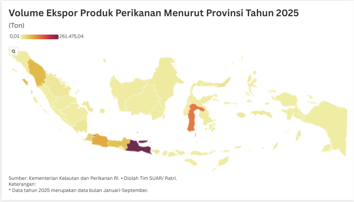- Data Kementerian Kelautan dan Perikanan periode 2021 hingga September 2025 menunjukkan volume ekspor hasil laut dan perikanan segar Indonesia sempat mencapai puncaknya pada tahun 2024 dengan angka 1.425,29 ribu ton. Secara nominal, nilai ekspornya dengan capaian tertinggi terjadi pada tahun 2022 sebesar 6.242,09 juta dolar AS. Kinerja ekspor hasil laut dan perikanan segar ini tidak lepas dari kontribusi besar sejumlah daerah di Indonesia. Berdasarkan data volume ekspor per provinsi dari KKP tahun 2025, Jawa Timur mengukuhkan posisinya sebagai pemimpin utama dengan kontribusi sebesar 261.475,04 ton dengan porsi 26% dari total.