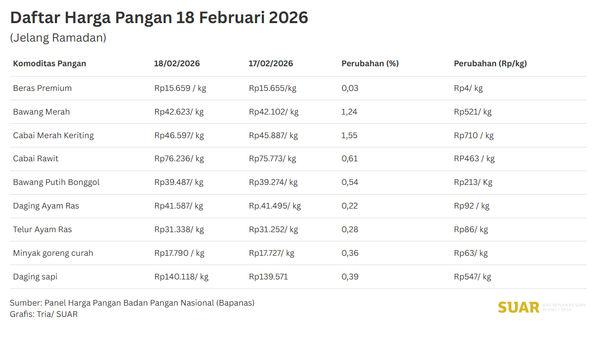 - Harga beberapa komoditas pangan menjelang Ramadan terpantau naik, seperti telur ayam, minyak goreng dan daging ayam, demikian disampaikan Menteri Perdagangan Budi Santoso, saat ditemui dalam kegiatan “Pasar Murah Ramadhan 2026” di kantor Kementerian Perdagangan, Jakarta (18/2). Bahkan menurut laporan beberapa media, harga cabai rawit di beberapa daerah seperti Kalimantan Tengah mencapai Rp104.000 per kg.