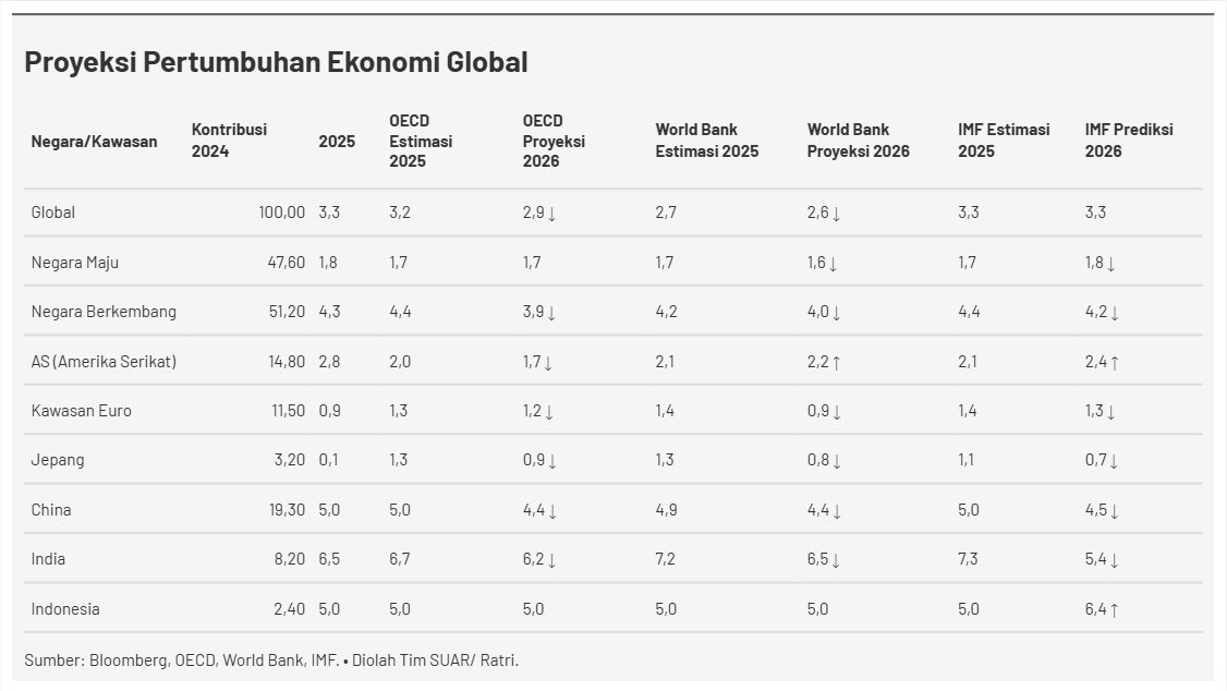 - Ekonomi global diprediksi menghadapi fase perlambatan pada tahun 2026. Berdasarkan data sejumlah organisasi seperti OECD, World Bank, dan IMF, pertumbuhan ekonomi dunia diperkirakan melandai ke kisaran 2,6% hingga 3,3%. Perlambatan ekonomi dunia dipicu oleh meningkatnya ketidakpastian global, mulai dari tensi dagang antara AS-China hingga tren fragmentasi rantai pasok yang menekan efisiensi perdagangan internasional. Meskipun terdapat upaya pemulihan pascapandemi, beban fiskal yang tinggi dan kebijakan moneter yang ketat di banyak negara maju membuat momentum pertumbuhan global kehilangan tenaga, memaksa para pelaku pasar untuk bersikap lebih waspada. Indonesia menjadi salah satu negara yang memiliki stabilitas ekonomi di tengah guncangan eksternal. Sementara banyak negara besar seperti India, China, bahkan Amerika Serikat diproyeksi menurun pertumbuhannya di tahun 2026, perekonomian Indonesia diproyeksi tetap terjaga di angka 5,0%.