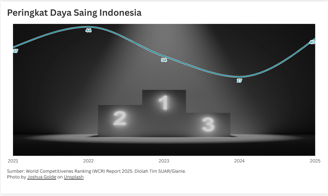- Peringkat daya saing Indonesia tahun 2025 menurut laporan World Competitivenes Ranking (WCR) menempati posisi 40 dari 69 negara. Peringkat ini turun 13 peringkat dari tahun sebelumnya (2024) yang berada di peringkat 27. Tahun 2024 menjadi tahun terbaik bagi Indonesia dalam lima tahun terakhir karena mencapai posisi daya saing yang cukup tinggi. Meski merosot 13 peringkat, Indonesia pernah menempati posisi yang lebih rendah yaitu di peringkat 44 pada tahun 2022. Namun saat itu, penurunan peringkat terjadi tidak sedalam sekarang, karena hanya turun 7 peringkat dari tahun sebelumnya. Jika dilihat ke dalam 4 komponen yang membentuk skor daya saing versi WCR, Indonesia mengalami penurunan pada 3 komponen, yaitu komponen pemerintahan yang efisien (Government Efficiency), bisnis yang efisien (Business Efficiency), dan komponen infrastruktur. Hanya di satu komponen, yakni kinerja ekonomi (Economic Performance), peringkat Indoensia tetap sama dibandingkan dengan tahun lalu, yakni peringkat 24.