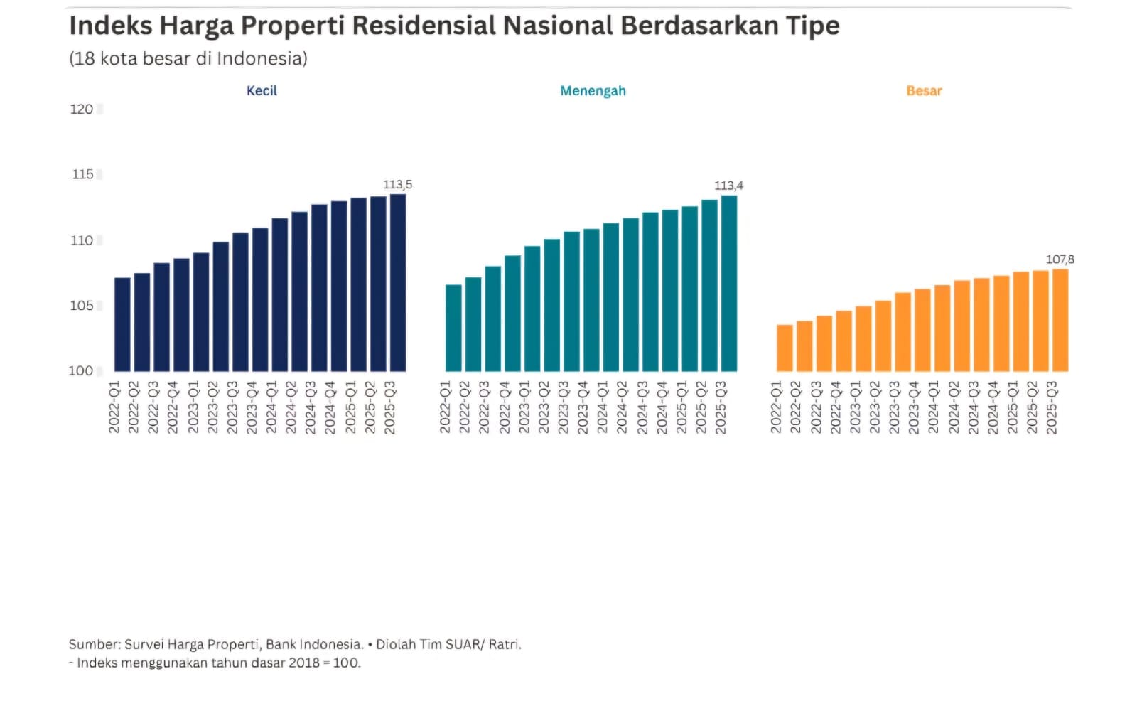 - Meski harga properti cenderung naik, laju kenaikannya relatif lebih rendah dibandingkan periode yang sama tahun lalu. Perlambatan ini terutama dipengaruhi oleh melambatnya kenaikan harga pada rumah tipe kecil dan menengah. Pertumbuhan IHPR secara kuartalan pada kuartal III-2025 relatif stabil di angka 0,22% (q-t-q) yang didorong oleh kenaikan pada rumah tipe kecil dan besar. Tipe menengah dan tipe besar juga menunjukkan tren serupa, meski dengan laju kenaikan yang sedikit lebih landai.