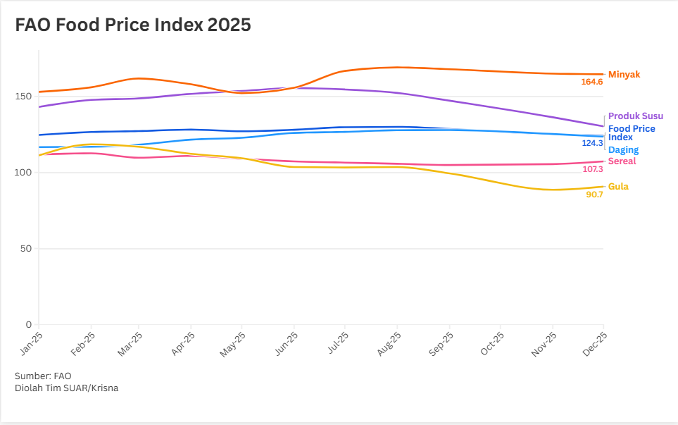 - Organisasi Pangan dan Pertanian Dunia (FAO) melaporkan indeks harga pangan global menunjukkan penurunan pada Desember 2025, mencapai level terendah sejak Agustus 2024. Dalam rilis terbarunya yang dirilis 9 Januari lalu, FAO mencatat Food Price Index (FFPI) pada Desember 2025 berada di level 124,3 poin, atau turun 0,6% dibandingkan bulan sebelumnya. Penurunan ini disebabkan oleh menurunnya harga produk susu, daging, dan minyak nabati. Untuk sepanjang 2025, indeks rata-rata harga pangan global berada di 127,2 poin, naik 4,3% dibandingkan dengan rata-rata 2024 yang berada di 122,0 poin.