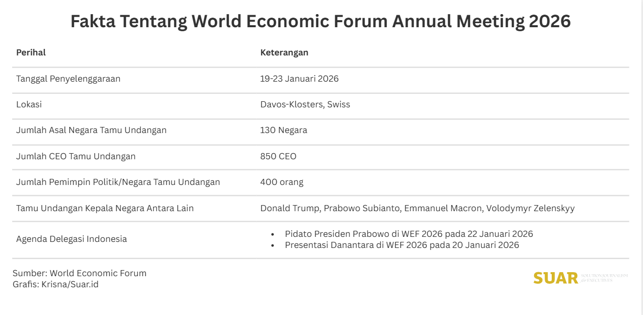 - Pembukaan Pertemuan Tahunan World Economic Forum 2026 di Davos, Swiss, menggaungkan seruan pentingnya dialog, keterbukaan kesempatan, dan kerja sama menghadapi perubahan. Di tengah menguatnya erosi kepercayaan terhadap institusi multilateral, WEF diharapkan mampu mempertemukan perspektif yang beragam demi memperluas cakrawala para pengambil keputusan politik dan ekonomi. Kementerian Investasi dan Hilirisasi/Badan Koordinasi Penanaman Modal (BKPM) bersama Danantara Indonesia dan Kamar Dagang dan Industri (Kadin) Indonesia akan berpartisipasi dalam Annual Meeting World Economic Forum (WEF) 2026. Partisipasi Indonesia di WEF bukanlah langkah yang bersifat ad hoc, melainkan wujud konsistensi diplomasi ekonomi yang telah dibangun selama bertahun-tahun.