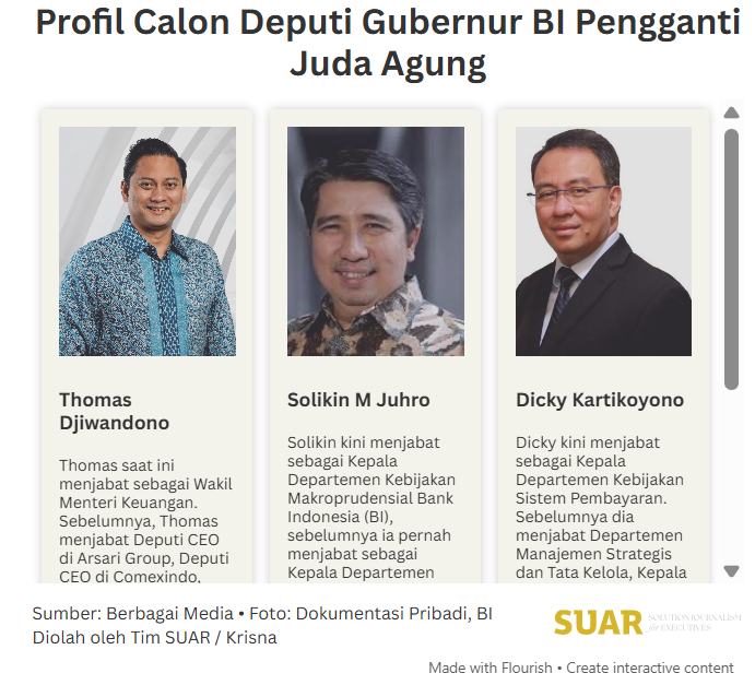 - Komisi XI Dewan Perwakilan Rakyat (DPR) menyebut Thomas Djiwandono sudah memenuhi syarat untuk mencalonkan diri sebagai Deputi Gubernur Bank Indonesia (BI), yang akan diputuskan dalam uji kepatutan dan kelayakan (fit and proper test) calon Gubernur BI pada 23-26 Januari 2026 nanti. Thomas menjadi calon kuat Deputi Gubernur BI usai Prabowo Subianto mengusulkan nama keponakannya beberapa waktu lalu, setelah Deputi Gubernur BI Juda Agung mengundurkan diri pada 13 Januari 2026. Misbakhun juga memastikan kalau Thomas Djiwandono akan segera melepaskan jabatannya di partai Gerindra saat dicalonkan. Menurutnya, hal ini sudah dipastikan oleh Gubernur BI, Perry Warjiyo.