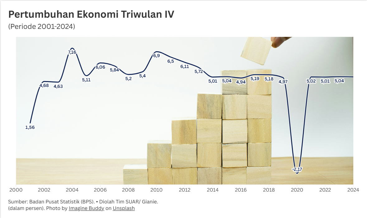 - Pada triwulan III-2025, perekonomian Indonesia tumbuh sebesar 5,04% secara tahunan. Secara kumulatif dari triwulan I hingga triwulan III-2025, pertumbuhan ekonomi nasional mencapai 5,01%. Angka ini sangat jauh dari target 5,2%. Kebijakan fiskal, moneter, investasi, dan konsumsi masyarakat harus benar-benar diperkuat untuk mencapai target tinggi tersebut. Secara historis, dalam periode 2001-2024, pertumbuhan ekonomi triwulan keempat yang tinggi melampaui tiga triwulan sebelumnya pernah terjadi. Tidak hanya sekali, tapi beberapa kali seperti yang ditunjukkan data Badan Pusat Statistik.